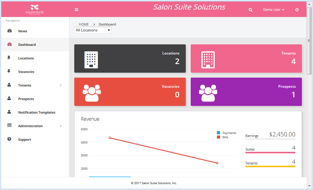 The Revenue section displays Payment data from the last year in the graph. Hovering over the graph columns displays the Payment value. The Bill data is depicted in a line graph and hovering over the circles displays the Bill value for that month. Earnings is ??. Hovering over the Suites item displays the Active Suite percentage.