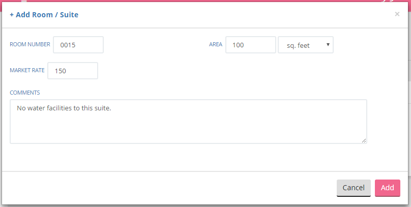 Suites are added to each Location to represent the individual rooms that are rented to Tenants. A Suite can be rented to more than one Tenant at a time.