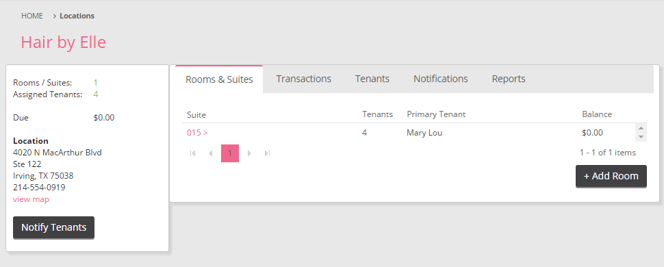 Each location can be viewed for further details from the Location Dashboard. The initial Location View includes a summary of the Rooms, Assigned Tenants and Amount Due on the right side. Lists of Rooms & Suites, Transactions, Tenants, Notifications and Reports are available on the left.