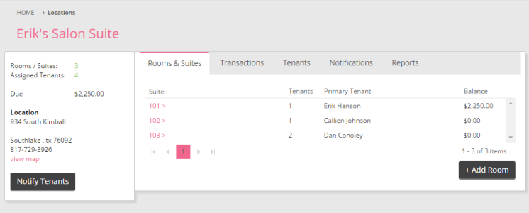 Suites are attached to an individual location. A list of suites for each Location is available from the Location View page. Suites are listed on the Rooms & Suites tab in ASCII sort order. Special characters are listed first, followed by numbers, then letters. Suites may be added to a location and individual suites may be edited.