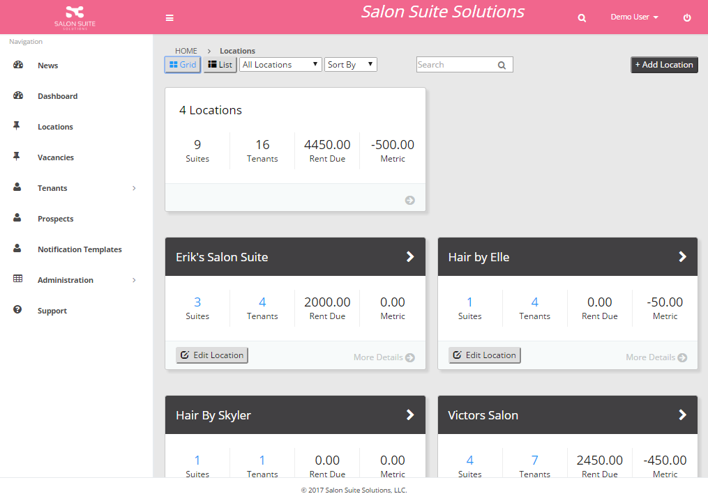 In grid view each location is displayed with the Location Name, total number of Suites, total number of Tenants, Rent Due and the Metric. To view more location details, such as a list of rooms, transactions, tenants, notifications and reports click on the Location Name heading. To edit the location details use the Edit Location button.