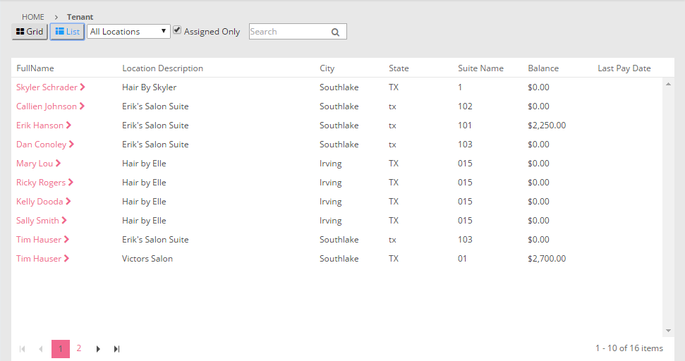 The Tenant list accessed from the left hand menu defaults to displaying only 'Assigned' Tenants. A Tenant is assigned to a suite when they are actively renting the suite. To view ALL Tenants, un-check the 'Assigned Only' box. The Tenant list displays in grid format by default. Click the List button to switch to a list view. It is possible to search the list of Tenants by first or last name using the search box.